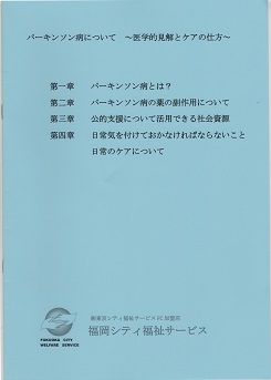 | レジュメ記載内容 | 第一章 パーキンソン病とは? 第二章 パーキンソン病の薬の副作用について 第三章 公的支援について活用できる社会資源 第四章 日常気を付けておかなければならないこと 日常のケアについて |